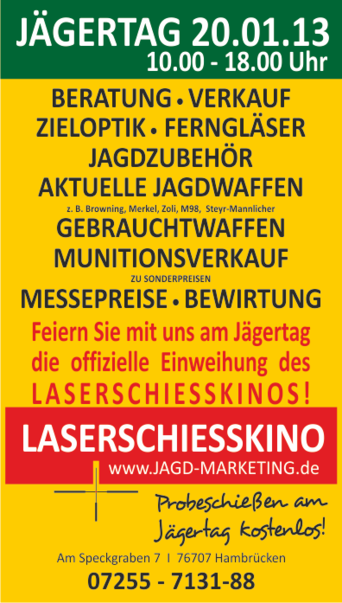 Im Jahr 2009 wurde der Ableger Jagd-Marketing gegründet, mit dem seither alles rund um die Jagd und den Jagdbedarf angeboten wird. Das neue High-End-Laserschießkino im Obergeschoss der Geschäftsräumlichkeiten erweitert die Möglichkeiten der Firma nun um ein Vielfaches und wird am Jägertag, 20.01.2013 feierlich eingeweiht, wobei hier auch ein kostenloses Probeschießen stattfindet. Darüber hinaus bietet die Firma Jagd-Marketing Jagdbekleidung, Zubehör, Jagdeinrichtung, Jagdwaffen und Zubehör, Zieloptiken, Ferngläser, Entfernungsmesser und vieles mehr. Das neue Laserschießkino soll nun zum Schießtraining für Jäger und Privatpersonen zur Verfügung stehen. Oberste Prämisse ist dabei der Trainingserfolg mit der eigenen Waffe oder mit einer Leihwaffe der Firma Jagd-Marketing, stellt Geschäftsführer Günter Krempel fest. Nur die Jagd selbst sei näher an der Realität als das Schießkino, so stellt Mitarbeiterin und Jägerin Susanne Peterhans fest. Jungjäger trainieren hier effektiv die Einschätzung von Jagdsituationen und lernen kennen. Aber auch erfahrene Jagdschützen nutzen die Möglichkeit, sich richtig fit zu machen. Zur Einweihung des Laserschießkinos gibt es attraktive Einführungspreise, zu erfragen unter Telefon 07255/7131-88 oder per Mail unter info@jagd-marketing.de.